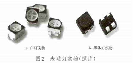 為了提高全彩LED顯示屏的對(duì)比度并降低對(duì)舞臺(tái)燈光的反射,表貼燈在封裝時(shí)還引入了黑體燈的理念:器件采用全黑體封裝設(shè)計(jì),從而更好地提高顯示屏對(duì)比度;器件膠體表面采用霧面設(shè)計(jì)從而有效降低反光干擾,使屏體畫面顯示更加柔和鮮艷。但采用黑體燈將大幅度降低同等驅(qū)動(dòng)電流下的發(fā)光亮度,從而使得同等亮度需求條件下的LED 顯示屏制造成本上升。表貼燈實(shí)物如圖2 所示。