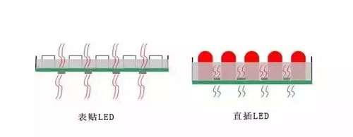 直插燈珠的導(dǎo)熱路徑長(zhǎng),熱阻高;而表貼是高杯矮腳,熱阻低,大大提升LED顯示屏的壽命。