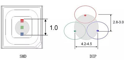 如上圖,對(duì)比DIP,SMD紅、綠、藍(lán)三顆芯片全在一個(gè)支架碗杯之中,距離近,故在不同角度紅、綠、藍(lán)三種亮度的匹配高度一致,混光效果更優(yōu),顏色還原更真實(shí),從而使戶外LED顯示屏色彩效果更逼真。
